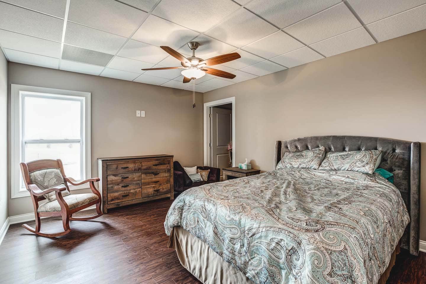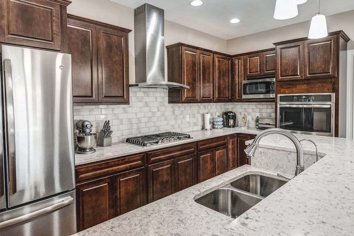 Recently completed in Newburgh, IN, this custom home boasts 2,107 square feet on the main level. In total, the floor plan accommodates 4 beds, 3 baths, and a fully finished walkout basement. In the kitchen, you’ll find Aristocraft cabinets with quartz tops, and wood look tile flooring throughout.